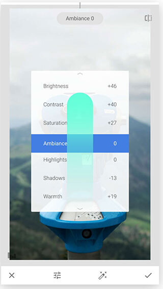 Snapseed 的多数调整方法是这样的:通过垂直滑动来选定参数,借助水平滑动去更改数值。
