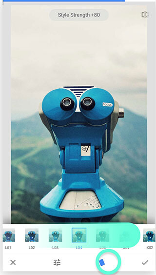点击工具选项卡即可开启编辑操作,这里陈列着Snapseed的全部功能。通过左右滑动来浏览各项选项,点击即可选中需要的工具。