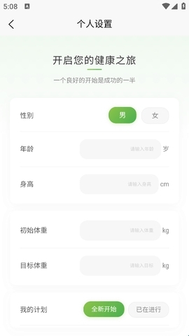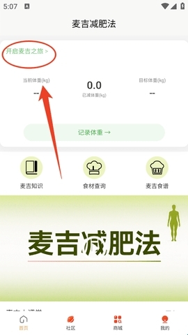 1、进入软件后,你的麦吉减肥之旅就可以开启了,请完善个人信息并记录体重哦。