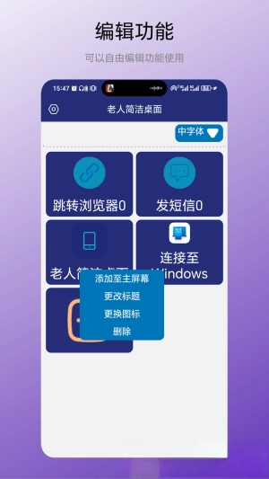 老人简洁桌面是专门面向中老年用户开发的安卓桌面环境,它具备简洁、清晰、易操作的特点,采用大字号、大图标以及高对比配色方案,还整合了电话、通讯录、短信、日历、天气等日常常用功能,操作方式直观易懂,就算是对智能手机不太熟悉的老人也能轻松使用。