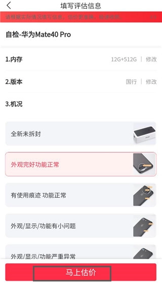 5、填妥机型信息、功能是否正常等内容后,点击立即估价。