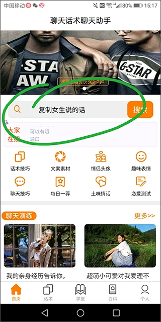2. 进入首页后便可开始使用,只需把女生对你说的话复制下来,粘贴到搜索框,系统就会自动为你搜索适配的话术内容。