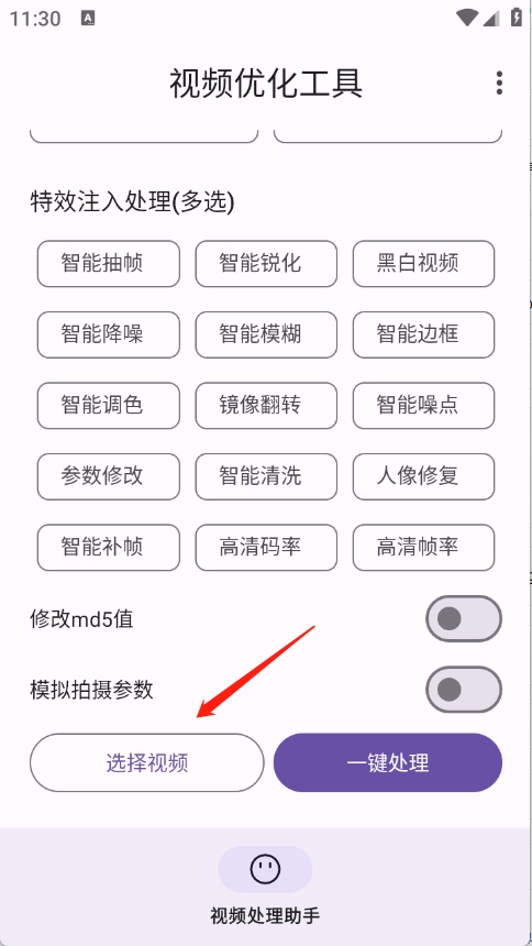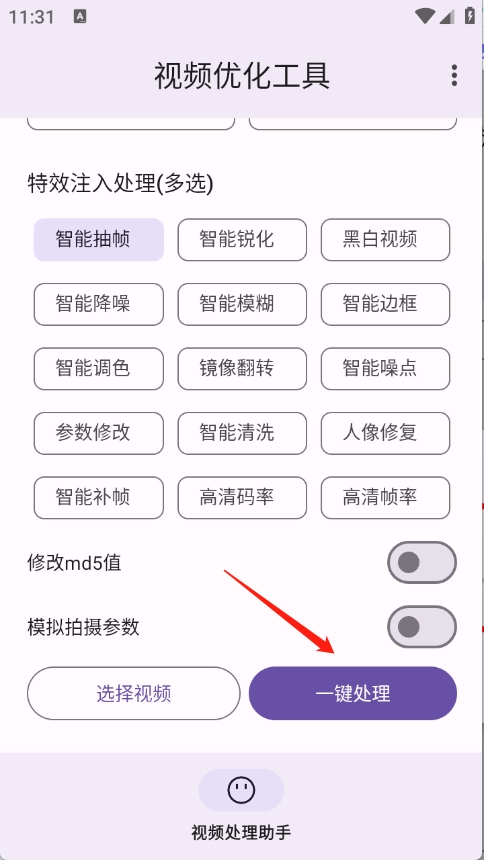 4、挑选AI算法与特效注入处理功能,点击“一键处理”按钮。