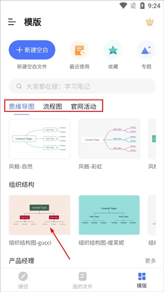 1、打开ProcessOn思维导图,有捷径、我的文件、模板等版块,模板里可以选择多种思维导图、流程图样式;