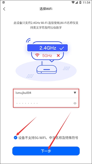 2、接着选择设备所连接的WiFi,输入正确密码后点击下一步;