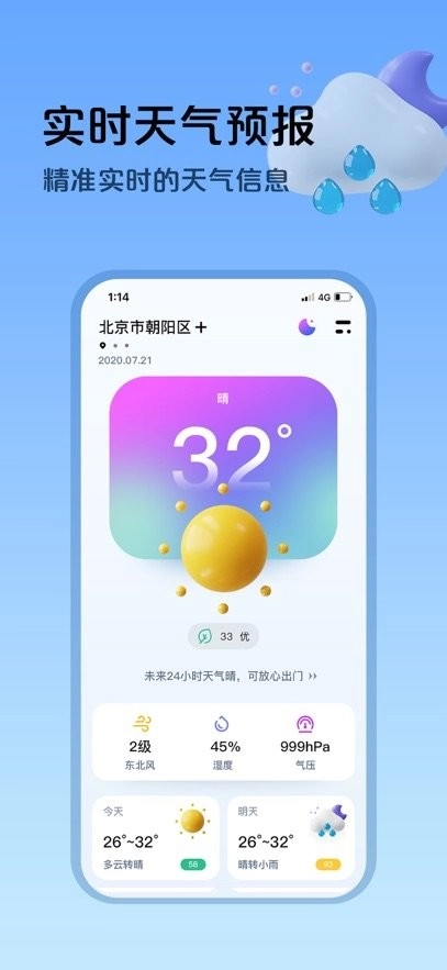 这是一款精准实时又好看的天气预报应用,支持的城市特别多,能让你查看每个城市的天气信息,它还会提前告知天气情况,这样每个人都能及时了解到最新的空气质量数据。