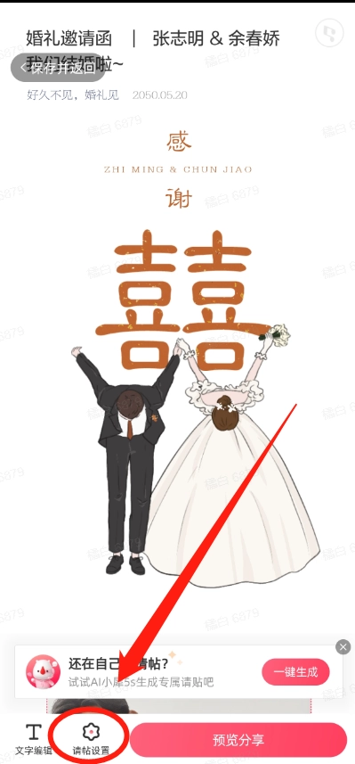 2、一键进入,然后点击底部的"请帖设置",如图。