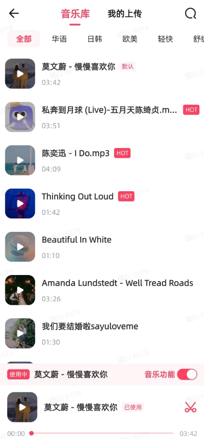 4、进入后可看到多种风格的音乐,滑动挑选需要的音乐并点击导入。