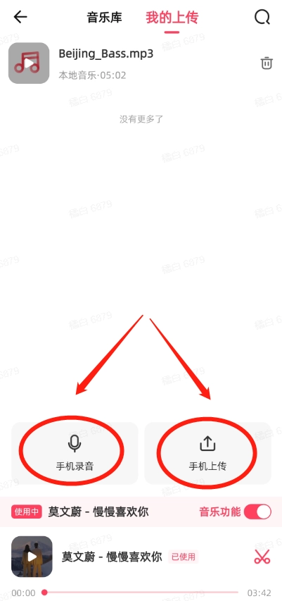 5、最后还能点击手机录音,或者通过手机上传自己喜欢的音乐,这样就能完成导入了。