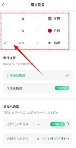 4、最后依据你的需求勾选所需的语言组合,例如“中英”“中日”或“中韩”互译。