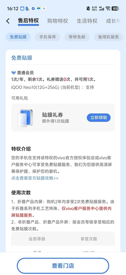 3、可以免费领取贴膜礼券,查看可以使用的门店,直接过去就可以免费给手机换张膜了。