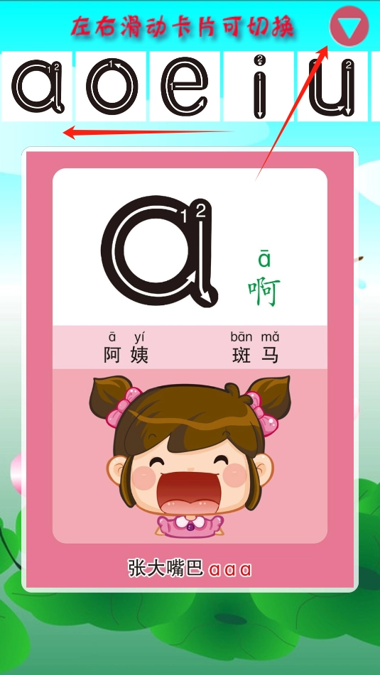 2、页面里可点击画面会发出啊的发音,滑动页面,可以切换其他字母。