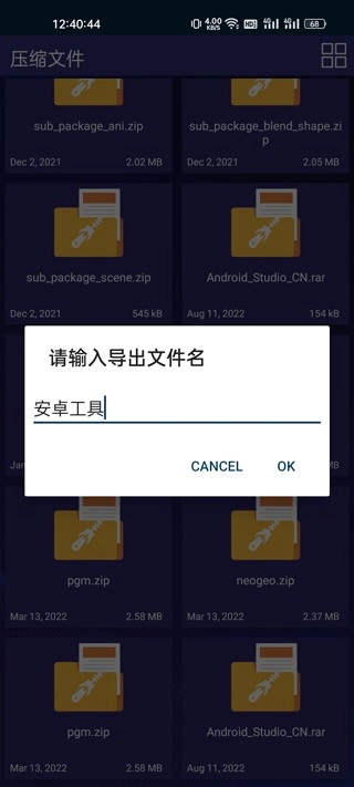 3、选择解压后会弹出要求输入导出文件名的提示,直接填写“安卓工具”作为文件名,点击OK按钮即可完成操作,若要取消则点击cancel。