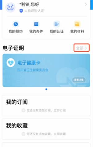 1、登录“天府通办”平台,依次进入【我的】页面、【电子证明】板块、【全部】选项,随后点击右上角的【添加证明】按钮。