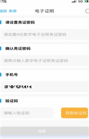 3、回到电子证明页面,点击刚才添加的证明,首次使用时需要设置【亮证密码】并完成短信验证。