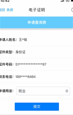 5、借助人脸识别完成实人认证,系统会自动填充申请人的相关信息,选好【申请用途】后点击【提交】按钮即可。