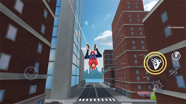 2、左侧控制方向,右侧释放技能;长按按钮吐出蛛丝,松开后收回;配合方向键还能在空中摇荡移动。
