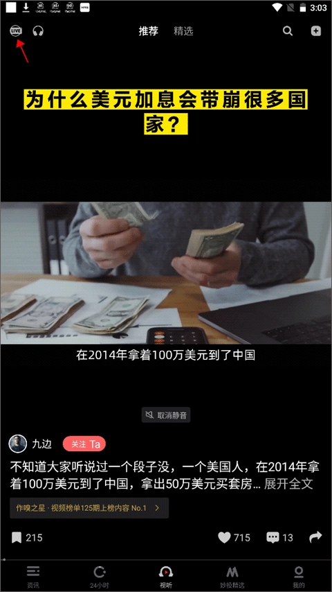 2. 在【视听】板块页面,点击左上角的“live”按钮。