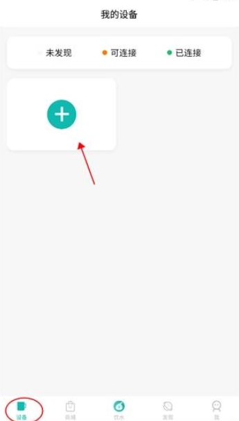 1、打开软件后会自动进入“饮水”界面,切换到“设备”模块后,点击界面上方的加号图标。