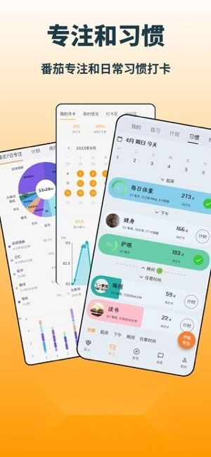 2、番茄钟与习惯养成系统相互联动,通过数据可视化的方式呈现进步曲线;