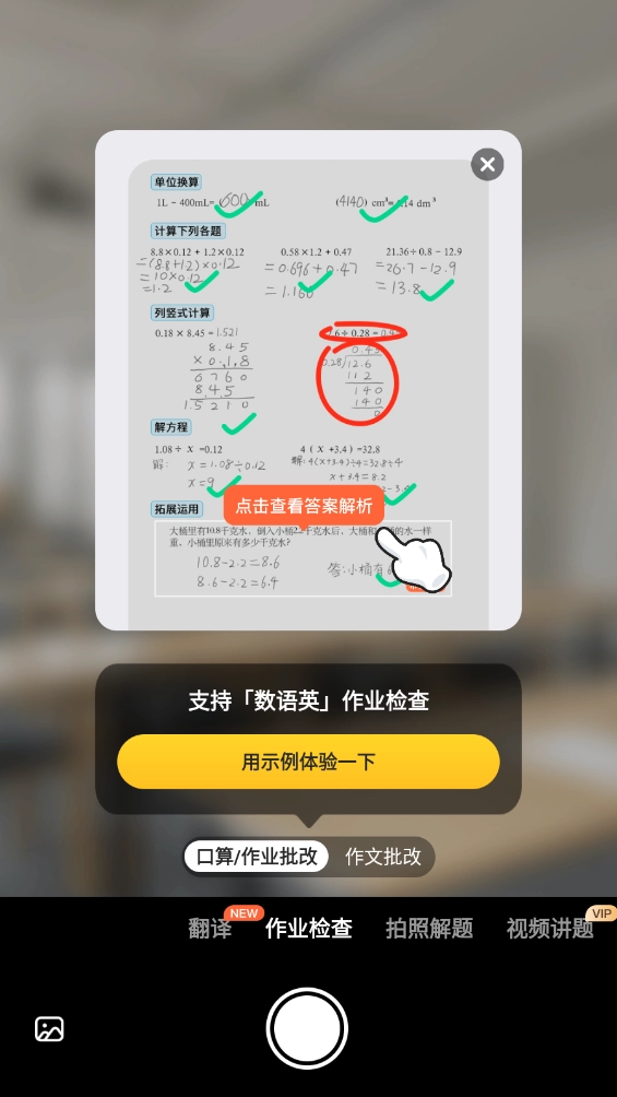 2、进入后对准拍照识别就能自动检查,还能查看解析讲解,支持「数语英」作业检查。