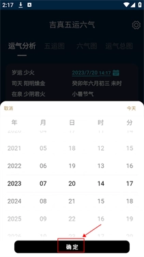 4、接着挑选你想查看运势对应的年、月、日、时、分,选好之后点击确定按钮