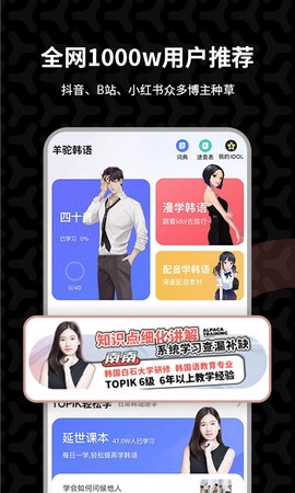 对于想要提高韩语口语能力的用户来说,羊驼韩语也提供了专业的韩语发音指导。通过软件,用户可以学习到韩语的正确发音,提高自己的口语表达能力。软件还提供了韩语日常对话学习的功能,让用户能够在日常生活中更加轻松地应用所学的韩语。除了学习功能之外,羊驼韩语还为用户提供了刷韩国综艺和韩剧的机会。