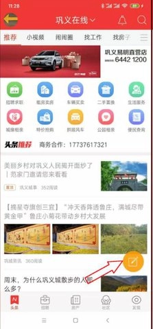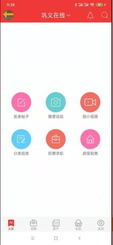 手机打开“巩义搜”App后,有两种发布方式:一是直接点击软件首页右下角的快速发布按钮,进入发布类型选择页面;二是在首页选择不同频道(如底部菜单的“招聘”“房产”“社区”等),进入对应频道后再进行发布。
