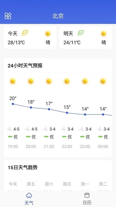 湛蓝天气日历为您呈现全方位的气象服务,涵盖实时天气、24小时逐小时预报及未来15天天气趋势;同时提供空气质量指数、温度动态、PM2.5等核心数据,搭配穿衣建议、紫外线强度、舒适度评估等实用生活指南。简约易用的设计,助力开启惬意生活!精准的实时监测与24小时小时级预报,让您提前掌握温度冷暖变化;未来2小时雨雪预报精确到分钟,出行规划更安心;15天超长周期预测,助您提前安排日常事务;空气质量与PM2.5实时查询,轻松应对雾霾等污染状况。