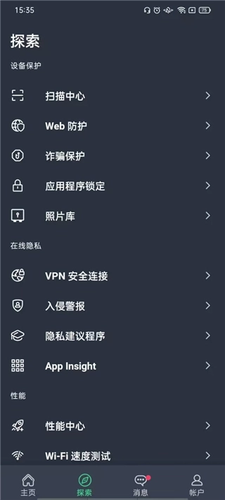 探索板块内设有设备防护、网络隐私、系统性能这三类核心功能选项。