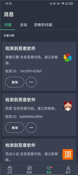 最后在消息页面中,我们可以查看手机扫描出的恶意文件、存在高风险的软件等内容,并且支持对这些风险项进行处理。