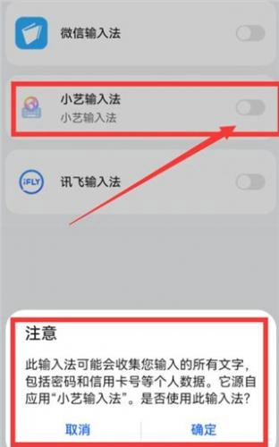 3、不用理会,直接点击“确定”,然后在下图中,选择“小艺输入法”,把它设置成默认输入法(我信也可以在手机设置的“系统和更新”里的“语言和输入法”里设置它为默认)。