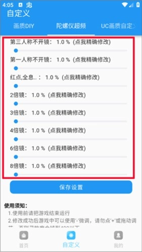 2、进入【自定义】选项,可手动调整画质参数,如画质DIY、陀螺仪超频、UC画质自定义,适配不同设备需求。