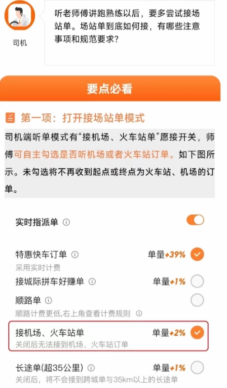 2、 新增场站听单计时功能,需开启机场 / 火车站单、实时单开关,关闭顺路模式才可计时接单。