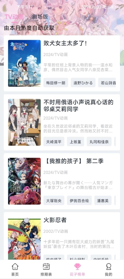 3、进入“花子榜单”功能模块,浏览当下热门动漫剧集的排名情况,发掘更多优质内容。