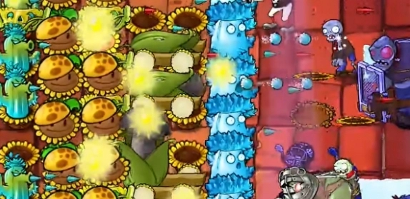 4、接着在中间增添若干毁灭加农炮,清除左侧的阳光向日葵,补上一列寒冰仙人掌。