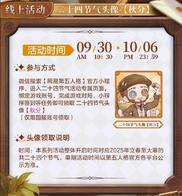 此外,秋分节气线上活动将在9月30日10点30分至10月6日23点59分期间开展。大家可以通过微信搜索【网易第五人格】官方小程序,进入二十四节气活动的专属页面。完成游戏账号绑定后,参与游戏对局、小程序签到等任务,就能领取二十四节气头像【秋分】(该头像仅限国服账号领取)。由于单期活动时间有限,想要获取秋分头像的访客们可别错过啦!画面里,“慈善家”正举着一颗橡果仔细端详,脸上满是喜悦,秋天丰收的信号已然降临,快进入游戏开启快乐的采秋之旅吧!
