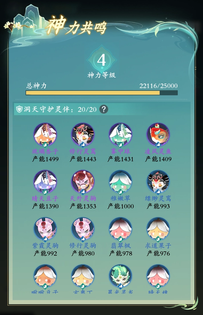 产能排名前20的灵伴会自动成为洞天的守护灵,洞天的神力为所有守护灵的产能总和,其中一部分神力用于维持洞天的稳定,剩余部分则转化为神力祝福,助力洞天主人提升自身属性。