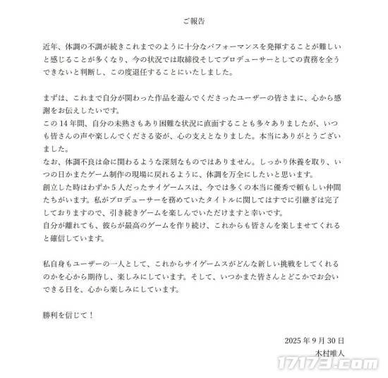 在这封个人署名的公开信里,木村唯人坦诚地说,最近几年身体情况一直不太好,已经没办法再保持高强度的工作节奏了。经过仔细的考虑,他决定暂时从一线岗位退下来,专心调理身体。“我打心底里感谢一直支持我的玩家们,还有一起奋斗的团队伙伴们,”他在声明中这样说道,“正是因为有你们的理解和鼓励,我才能坚持到现在。”