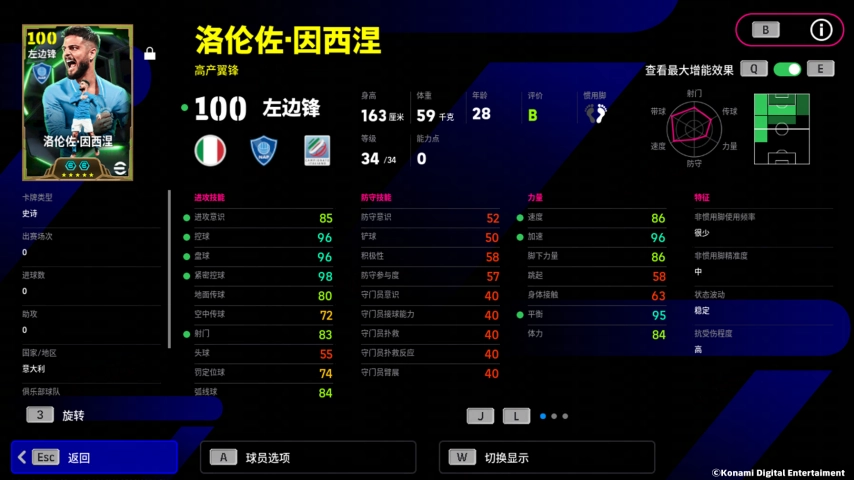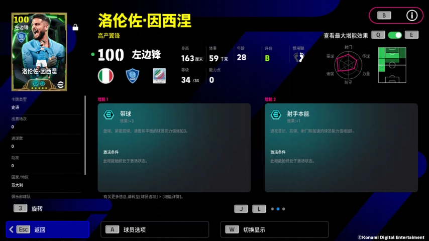 因西涅的增能属性是【带球 +3】,凭借顶级的盘控数值,他足以制霸球队左路!此外,因西涅还拥有特殊技能【弧线落叶射门】,再加上不错的射门数值,他在禁区外也能搓出美妙弧线,直挂球门死角!