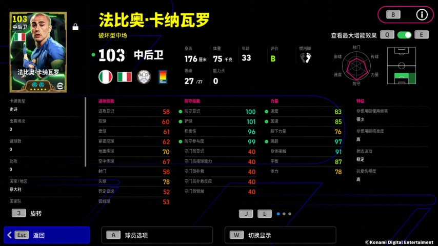 卡纳瓦罗的增能属性为【防守 +3】,让这位金球后卫成为前锋的梦魇!