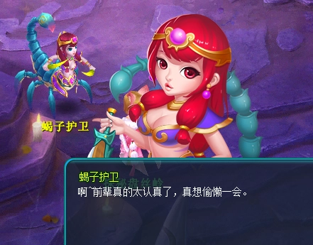 接下来让我们看看盘丝岭的NPC们,就像这位蝎子护卫。和她交谈后能发现,她是刚加入盘丝岭不久的新人,不过显然很精通摸鱼之道,不好好履行护卫职责,一整天都在琢磨着怎么偷懒呢……