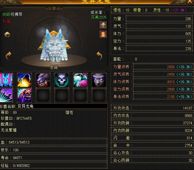 装备都凑齐顶配了,宝宝自然也不能落下。系统直接给备好了几只PVP毕业级的神宠。扫了一眼,这只变异龙龟真不赖,成长率是完美的2035,体力资质更是快摸到5000了。