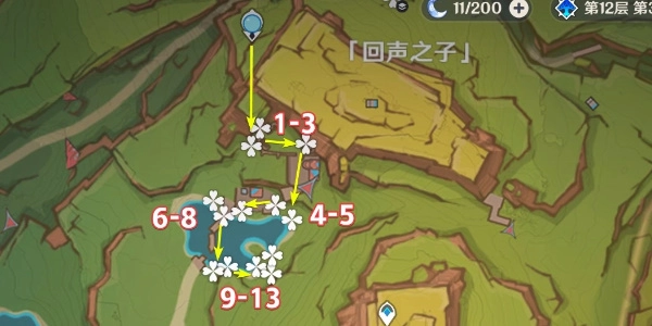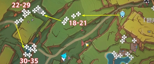 传送到临近回声之子部落的七天神像处,依照下图所示路线,能够采集到18个肉龙掌。