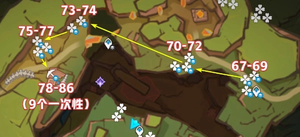 传送到位于硫晶支脉上方的传送锚点,依照下图所示路线,能够采集到17个肉龙掌。