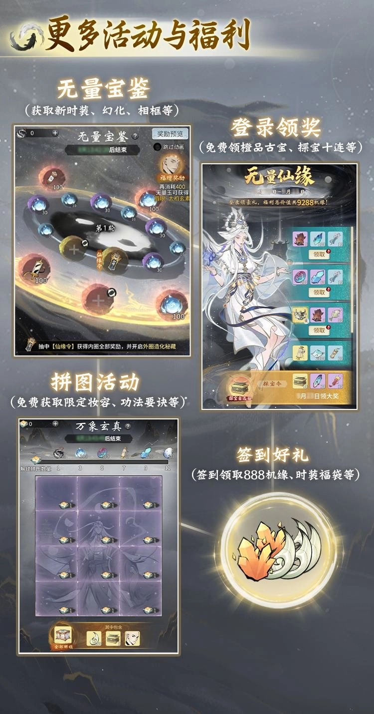 签到即可免费领取888机缘、时装福袋等好礼,福袋中说不定能开出永久时装;精魄转换、药园灌溉双倍福利限时开启。参与万象玄真活动,限定妆容、功法要诀等奖励免费领;探索无量宝鉴,还有机会获得新时装、幻化与古宝。