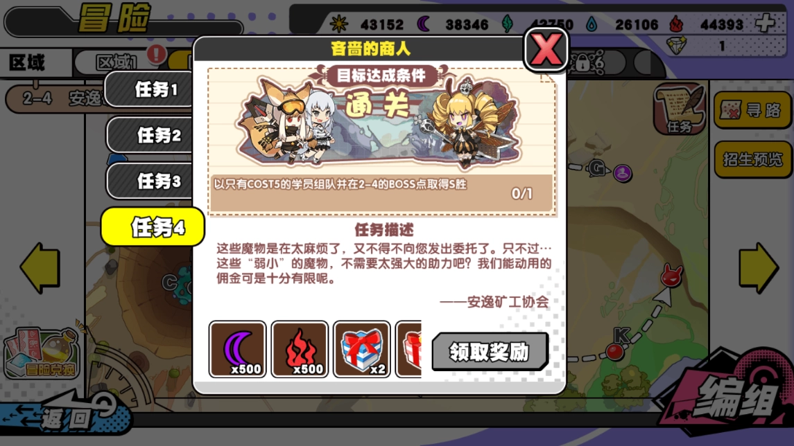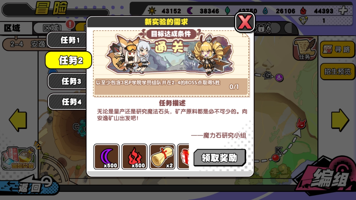 2、任务奖励:五百个黑石头,五百个赤石头,两个潜能之证(该道具可在激活学员潜能时,替代一定权重的同名卡消耗,获取途径为在源之屋劝退3、4、5星级学员),两个随机礼物包。