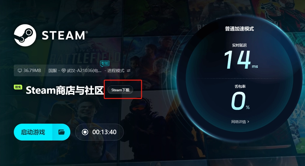 经过加速后,网络体验不仅得到了优化,我们还为大家提供了快捷登录Steam官网的途径。在“社区”字样的旁边,能看到一个【Steam下载】的图标,点击这个图标就能直接跳转至官网,大家可以放心下载完整的软件啦。