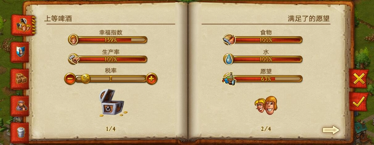接下来是税收系统,在城镇界面里能够调节税收的高低。游戏设计得挺形象的,在税收选项下方画了个宝箱,初始设置下宝箱周围肯定只有寥寥几个金币,税收调得越高,宝箱旁的金币数量就会越多。