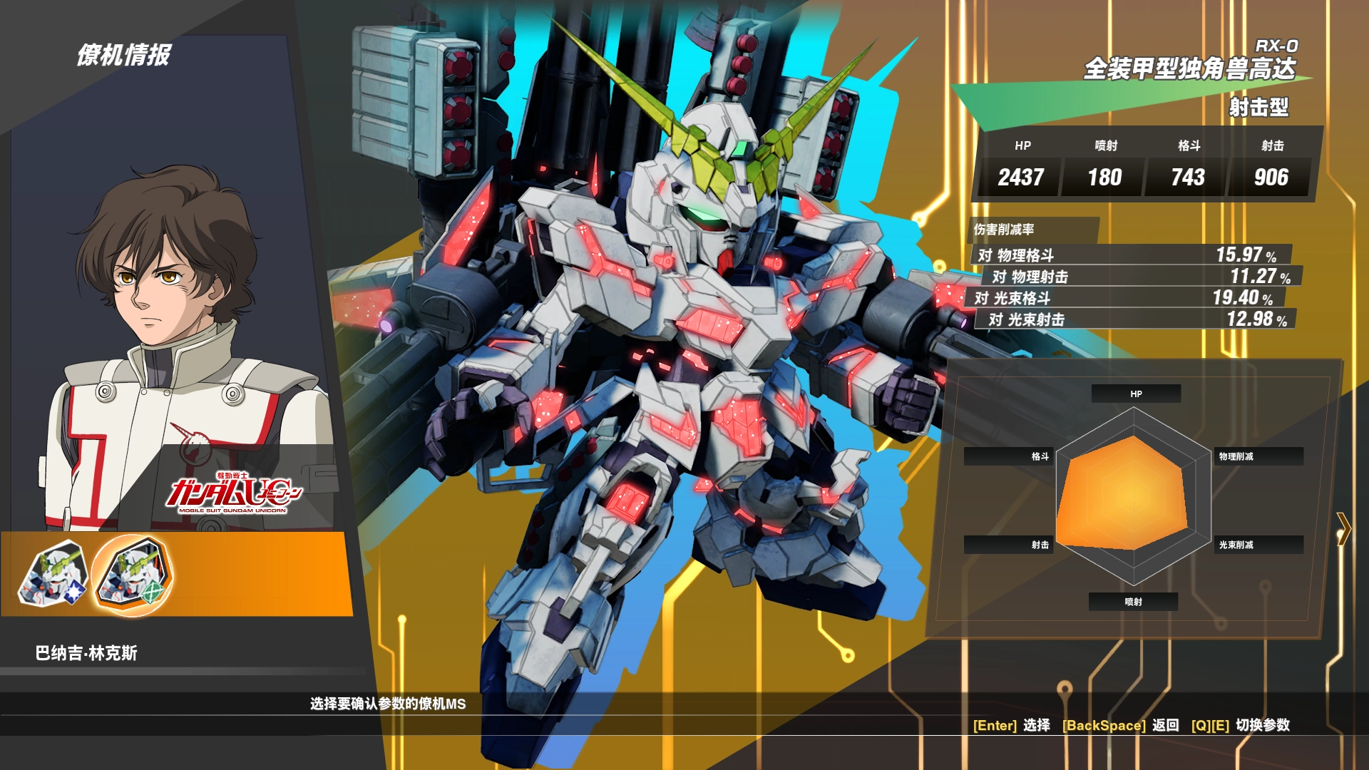 在所有机型里,格斗数值最高的当属The-one,这款高达把等级拉满后,格斗数据能接近一千,确实相当惊人;不过它的普通攻击速度偏慢,物理削减能力也比较弱。射击数值最高的是报丧女妖改造版,大概在八百左右——毕竟射击玩法不用付出太大代价就能很好地拉扯敌人,所以数据没格斗型高也合情合理。而喷射数值最高的是独角兽高达,等级升满后喷射数据差不多能到两百上下。